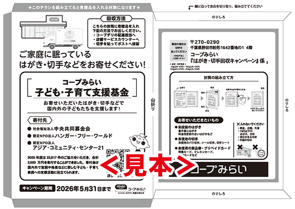コープみらい、いばらきコープ、とちぎコープ、コープぐんま、コープデリにいがたは、SDGsの理念である「誰一人取り残さない」の取り組みを推進するため、はがき・切手などを皆さんに寄付いただき、その換金で得られる資金を「取り残されている子ども、取り残される恐れがある子ども」の支援活動をしている団体へ寄付する「はがき・切手回収キャンペーン」に取り組んでいます。